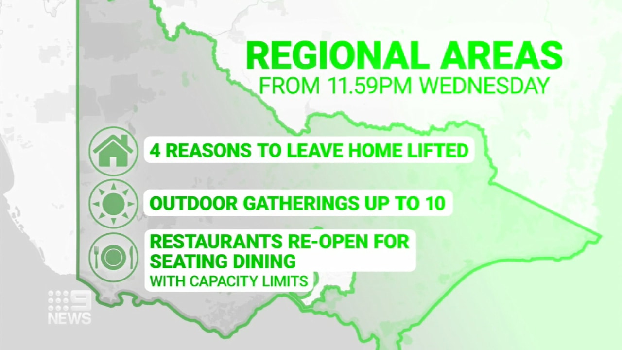 Auctions will be limited to 10 people, plus the minimum amount of people required to facilitate the sale and those selling the house. Regional victoria changes restrictions will ease in regional victoria this week, as a cautious pause is placed on the lockdown being lifted in metropolitan melbourne due to an outbreak in the northern suburbs. Curfew would be lifted and there will no longer be restrictions on leaving the home, with gatherings of 10 people outdoors allowed. What are the main changes? Victoria's current restrictions won't be eased until at least may 11.